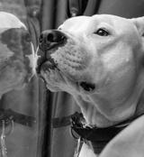 The white bull terrier is looking from a window at bus.