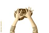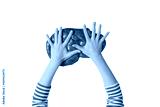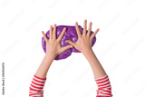 Child hands and purple shiny slime. Child girl plays with slime isolated on white. Home educational games concept. Top view, flat lay banner