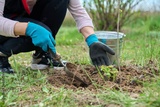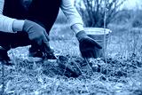 Close-up of gardener's hands in gloves with shovel digging currant bush