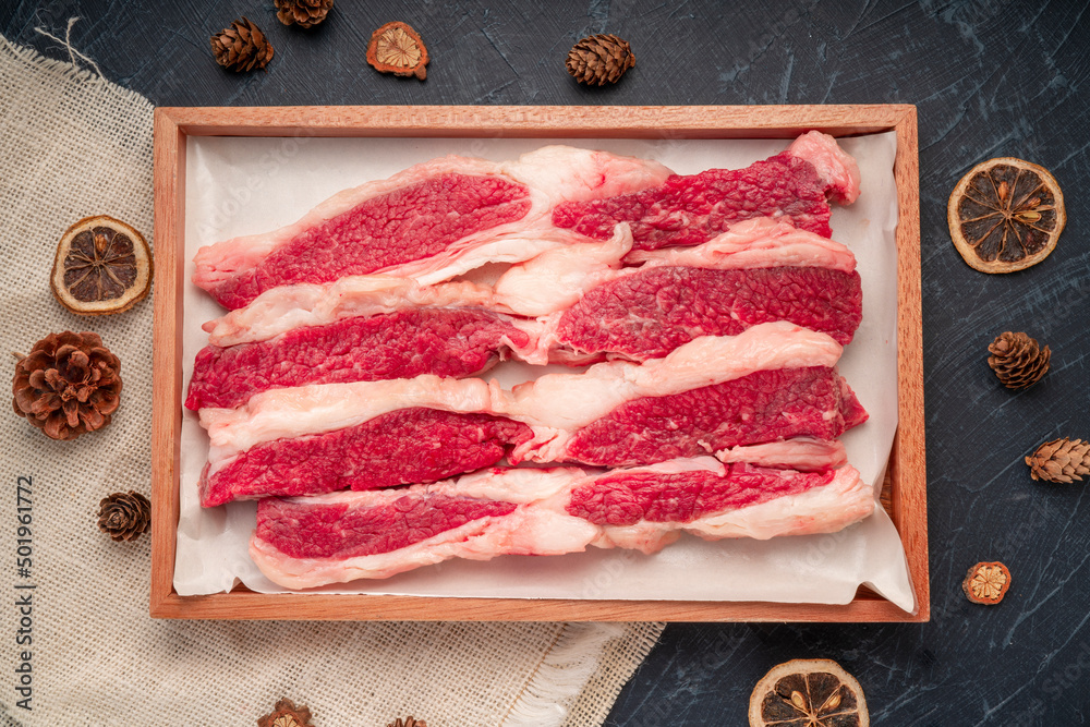 Fresh Sliced brisket beef with rosemary on wooden plate, Sliced brisket beef on black wooden background.
