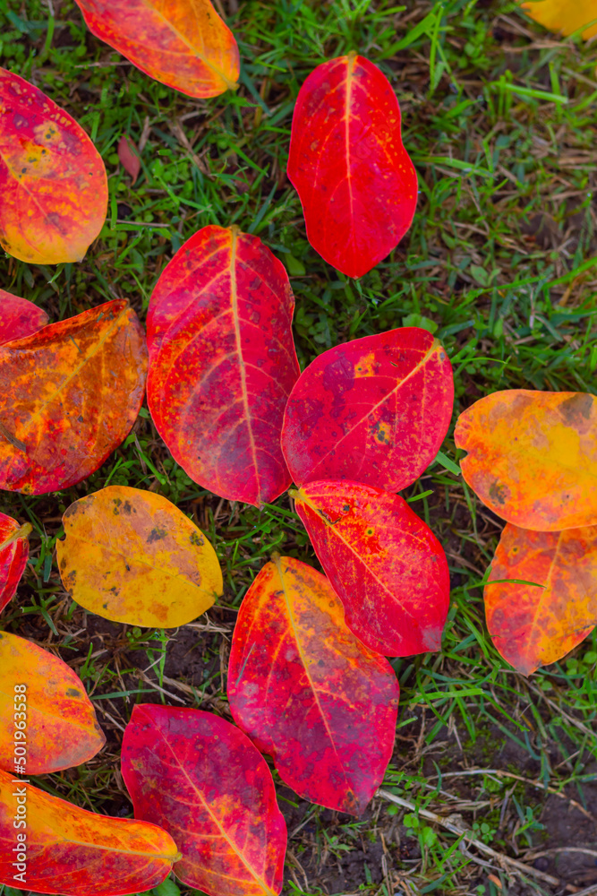 Red foliage at autumn. Autumn background photo. Fallen leaves