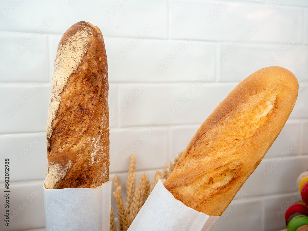 Close-up two original french baguettes bread wrapped with papers on white wall background.