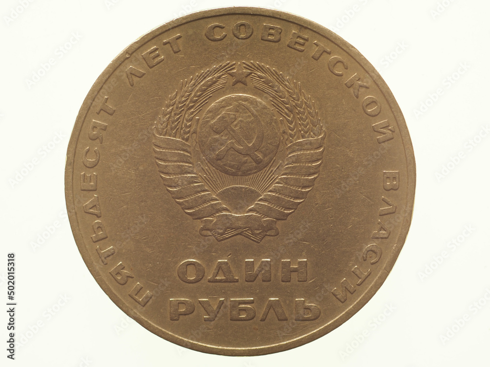 1 Ruble coin, front side showing 50 years of Soviet power, curre