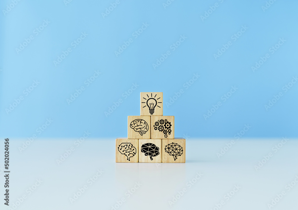 Cube with brain icon. Business strategy planning and solution or education knowledge success idea. Businessperson or student growth in improvement or development. Studying or learning achievement