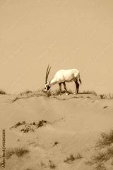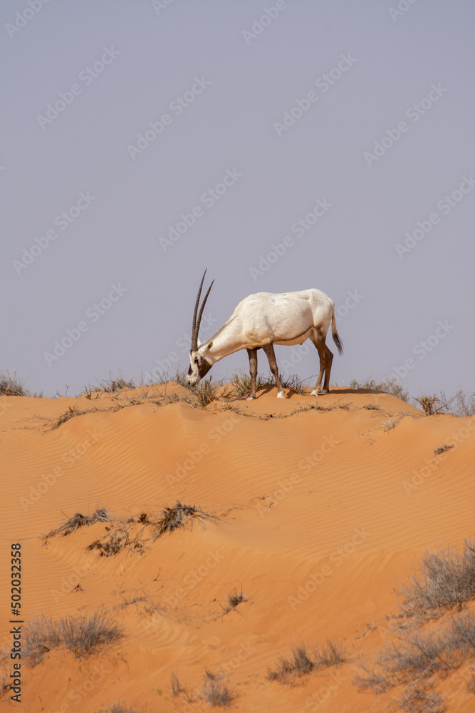 An arabian oryx (Oryx leucoryx) critically endangered resident of the Arabian Gulf stands in the hot desert in conservation area.