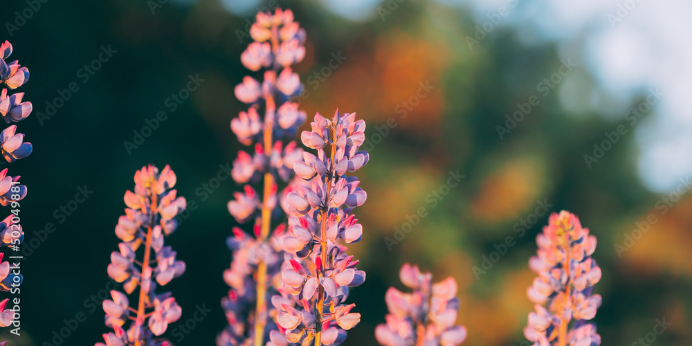 panorama Wild Flowers Lupine In Summer Field Meadow At Sunset Sunrise. Close Up. Copyspace. Lupinus, Commonly Known As Lupin Or Lupine, Is A Genus Of Flowering Plants In The Legume Family, Fabaceae.