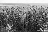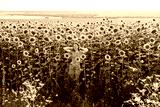 Sunny beautiful young cheerful girl walks alone among the field of sunflowers.