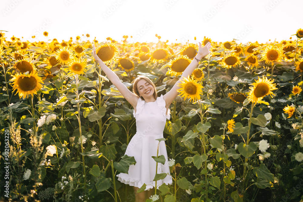 Beautiful young female enjoying nature on field of sunflowers at sunset