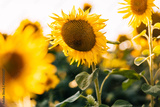 Large yellow sunflowers bloomed on a farm field in summer. The agricultural industry, production of sunflower oil, honey. Healthy ecology organic farming, nature background.