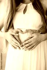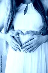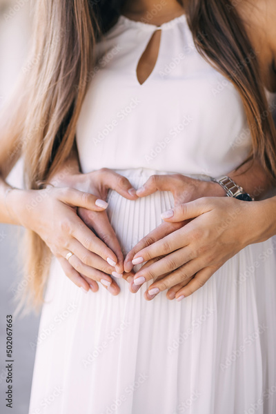 A beautiful young pregnant woman and her husband hold their hands together in the shape of a heart. Mom and dad are expecting a newborn