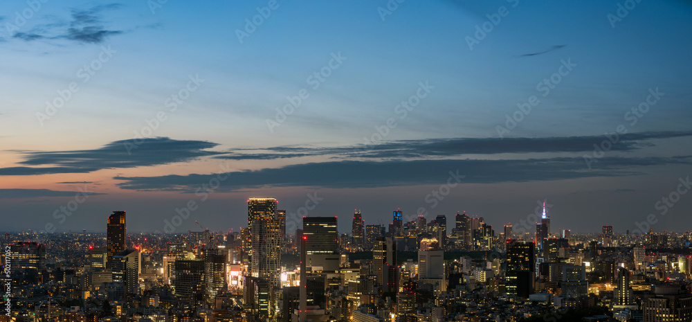 Tokyo Shinjyuku and Shibuya area panoramic view at magic hour.