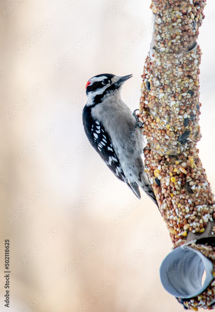 Downy woodpecker on a hand made feeder made of seed, suet and toilet paper rolls