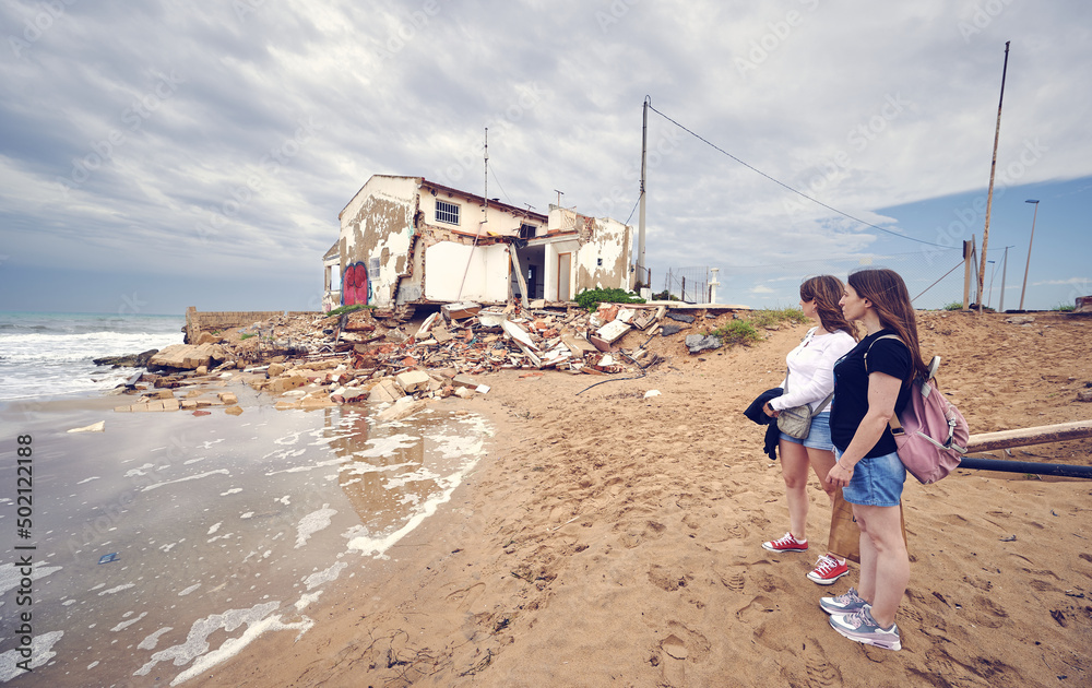 Two women watching how the high tide created by a tsunami destroys the houses located on the coast, in front of a beach. Ruined houses are reduced to rubble and disappear with the waves of the ocean.
