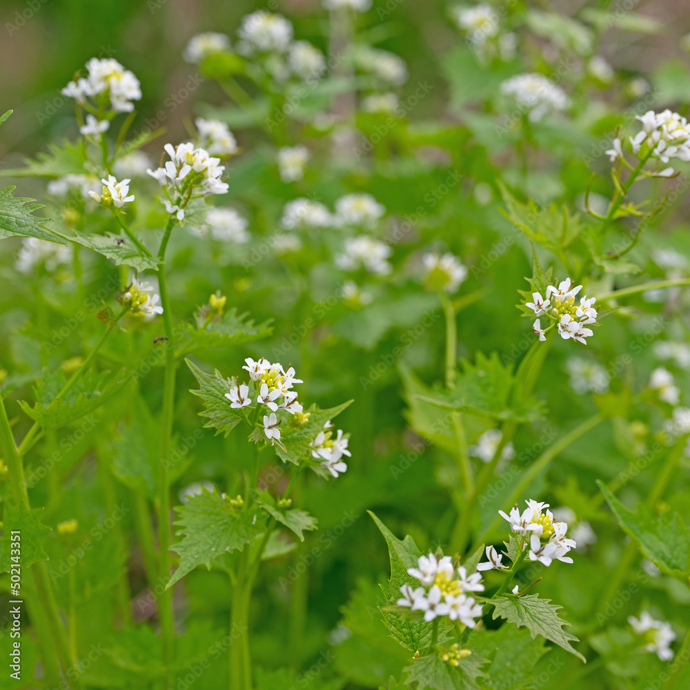 Blühende Knoblauchsrauke, Alliaria petiolata, im Frühling