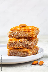 Stack of Baklava slices. Layered pastry dessert made of filo pastry, filled with chopped almond nuts, and sweetened with syrup or honey. Middle Eastern and Mediterranean sweet food. Homemade.