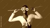 Portrait of a happy young woman holding orange Gerbera daisy covering her eye with eyes closed