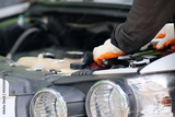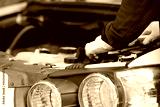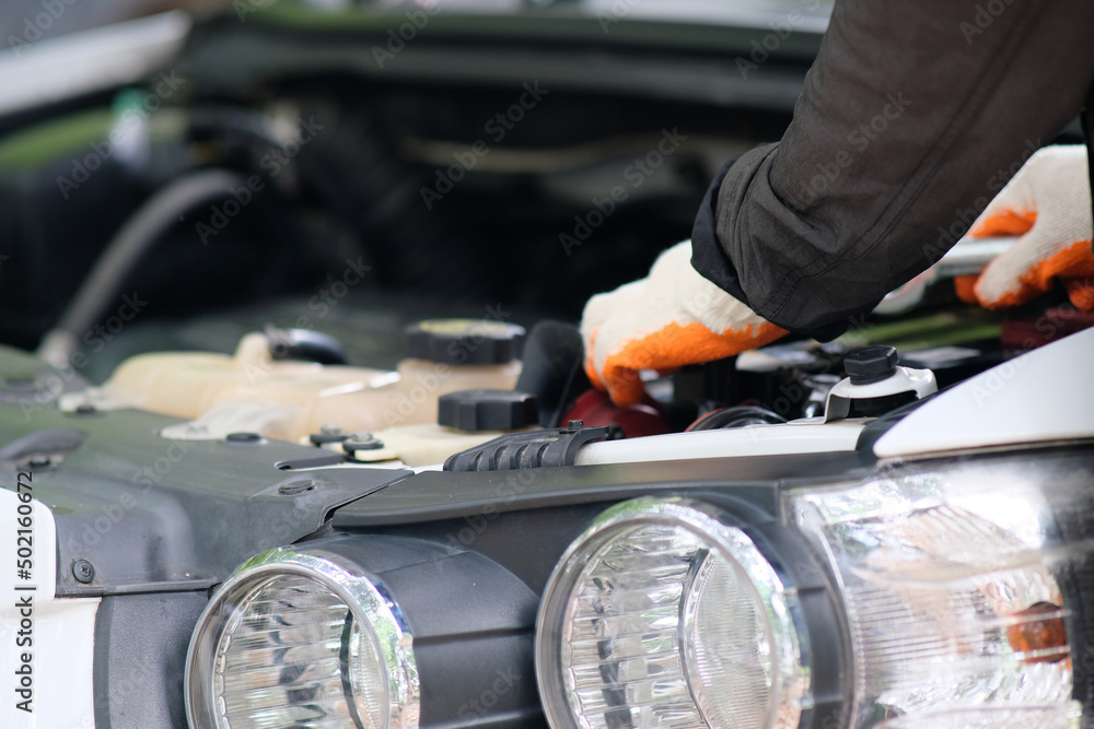 Hands of an automobile mechanic repairman with a wrench repairing a car engine at an automotive workshop, car servicing and maintenance, repair service.