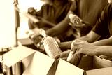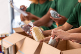 charity, donation and volunteering concept - close up of international group of happy smiling volunteers packing food in boxes at distribution or refugee assistance center