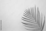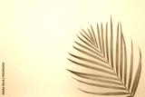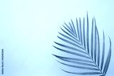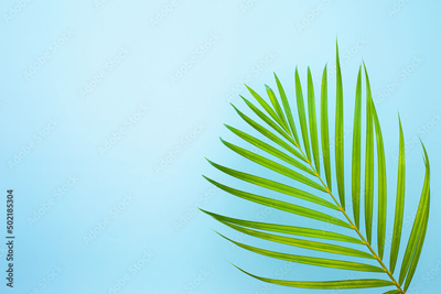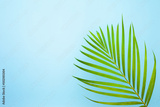 top view of tropical palm leaf on blue color background. minimal summer concept, flat lay, copy space.