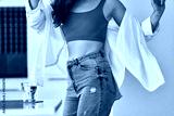 Sexual woman with beautiful thin fit body figure and slim waist wearing jeans, top and white shirt