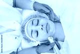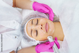 A dermatologist performs a healing procedure on a woman's face. Mask in a beauty salon. The beautician holds a brush in her hand and applies the cosmetic to the woman's face.