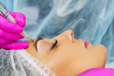 Beautician applying permanent makeup on eyebrows of young woman by special tattoo machine tool