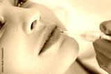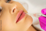 Young woman having permanent makeup on lips in beautician salon, closeup