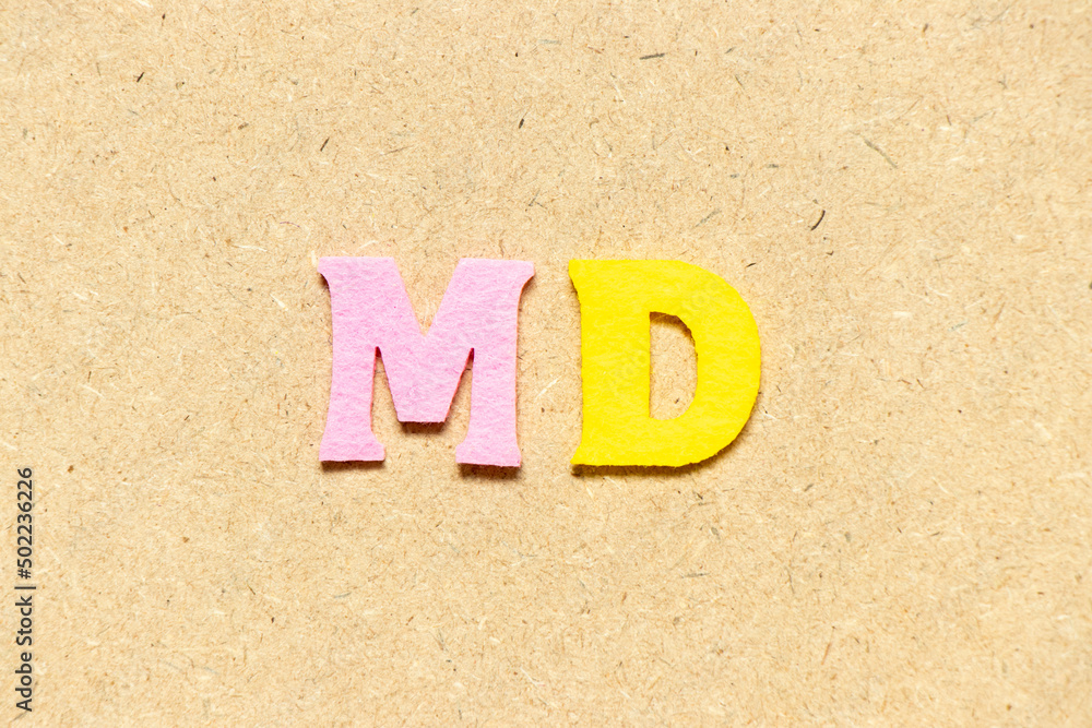 Color cloth alphabet letter in word MD (abbreviation of doctor of medicine or managing director) on wood background