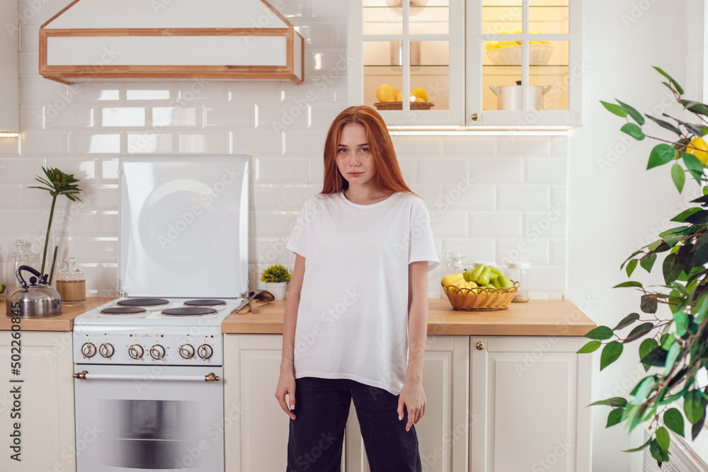 Young red-haired woman in a white t-shirt stands in the kitchen.