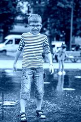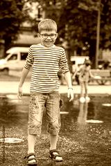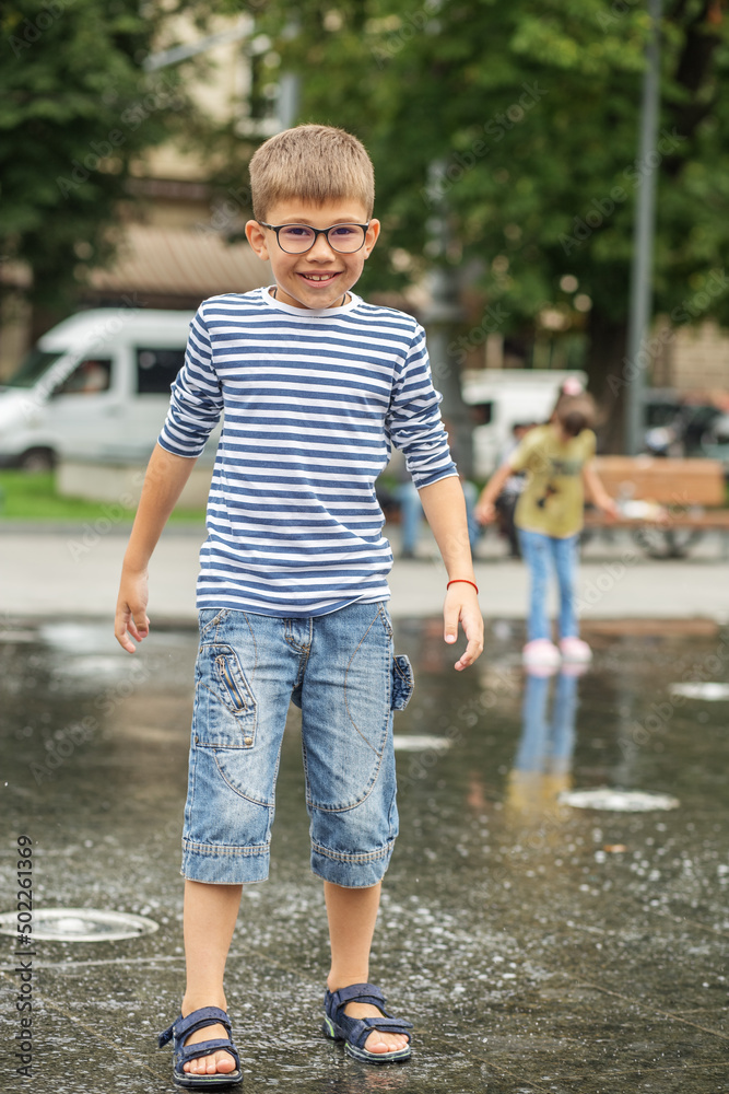 Happy little boy playing in square between jets of water in dry fountain on summer day. Having fun
