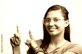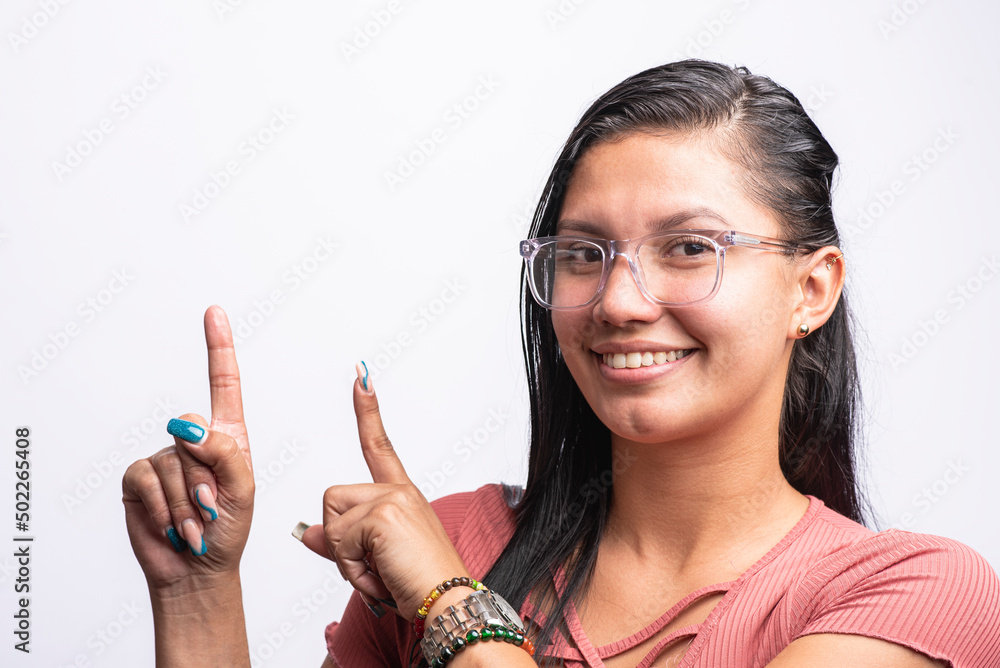 Portrait of smiling latina woman wearing glasses and pointing up on white background.