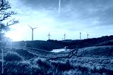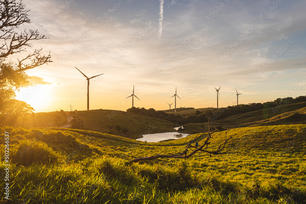 Beautiful landscape of a lake with wind towers in the background illuminated by the light of a beautiful sunset.