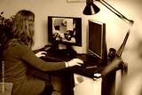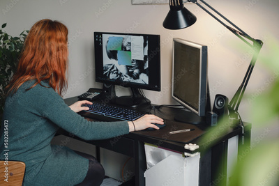 Woman working on keyboard and computer. Freelancer doing her work at home. IT specialist writing letter or coding program on two screens. Copy space