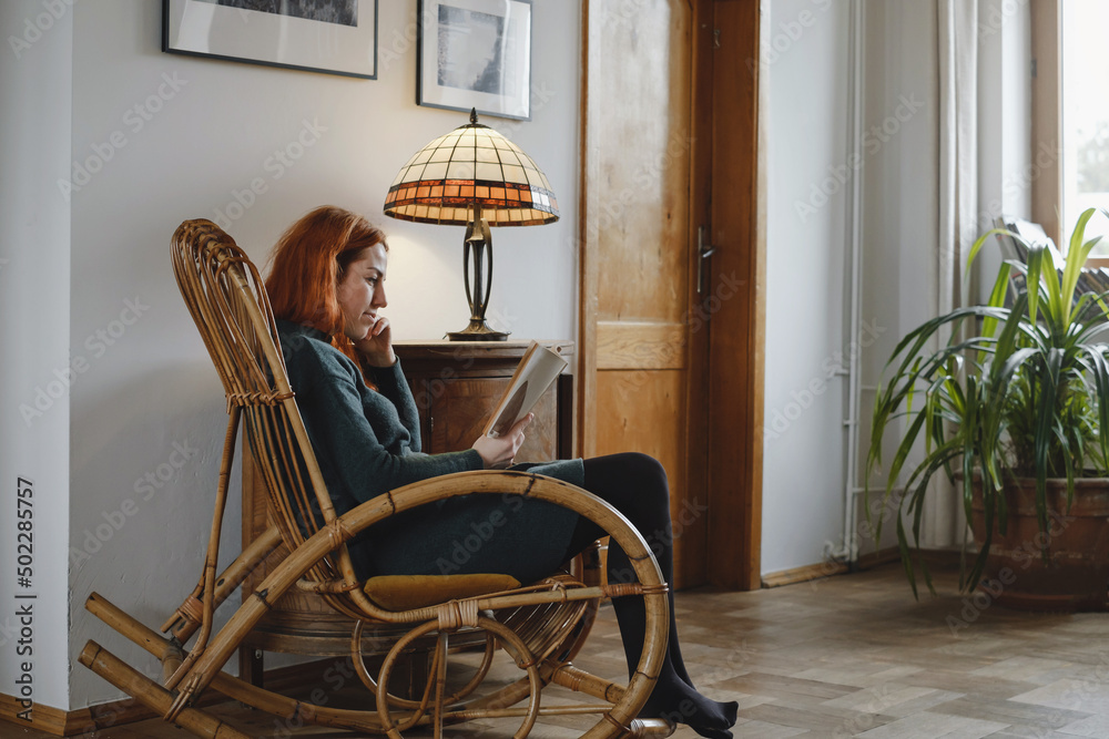 Woman on rocking chair reading book. Relaxed home atmosphere. Vintage house for slow living. Female at her 40s having rest. Cozy place