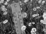 Thermometer auf einer Blumenwiese in der Sommerhitze