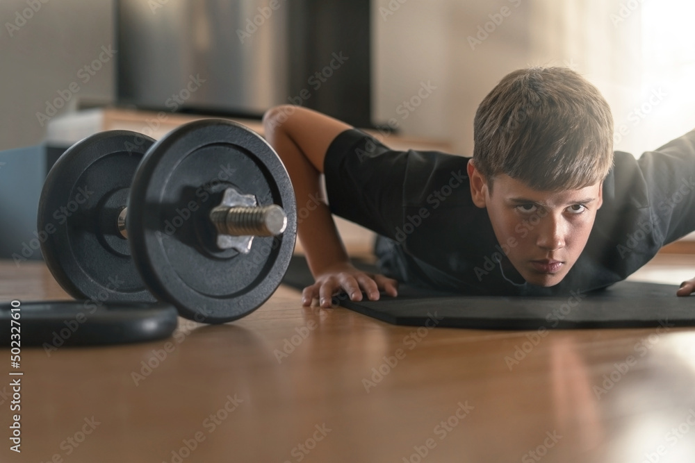 Young man workout at home.Determined teenage boy doing push ups in his living room
