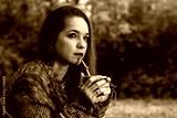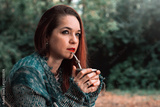 Mujer bonita tomando mate en el bosque al atardecer. Cultura Argentina