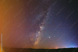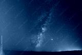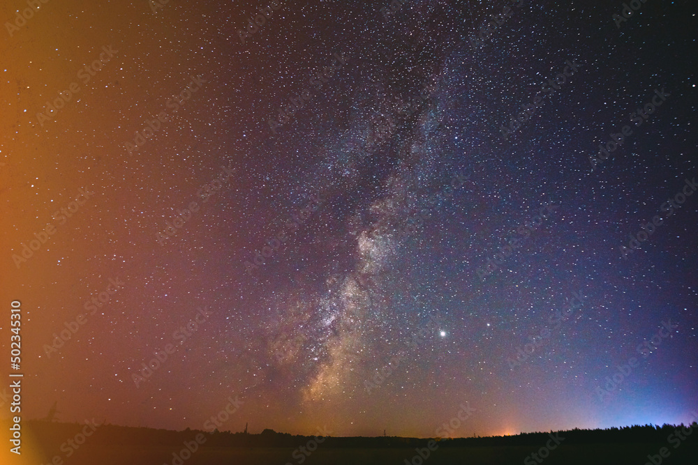 milky way above dark landscape. Colorful flare flash haze on starry sky. Sky Stars. Starry Sky Background Backdrop.