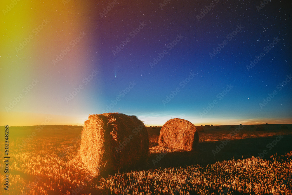 Comet Neowise In Night Starry Sky Above Haystacks In Summer Agricultural Field. Night Stars Above Rural Landscape With Hay Bales After Harvest. Colorful flare flash haze on starry sky. Sky Stars