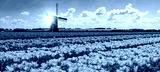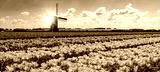 Panorama of landscape with blooming colorful tulip field, traditional dutch windmill and blue cloudy sky in Netherlands Holland , Europe - Tulips flowers background panoramic banner