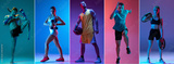Collage of professional sportsmen in sports uniform isolated on multicolored background in neon light. Flyer. Advertising, sport life concept
