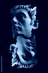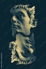 Collage with antique sculpture of human face in surreal style. Modern creative concept image with ancient statue head. Zine culture. Contemporary art poster. Funky punk minimalism. Unusual design.