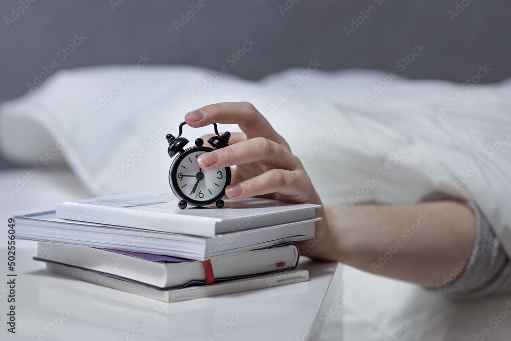 the hand turns off the alarm clock early in the morning, the mode of the day, wake up from the alarm clock