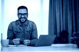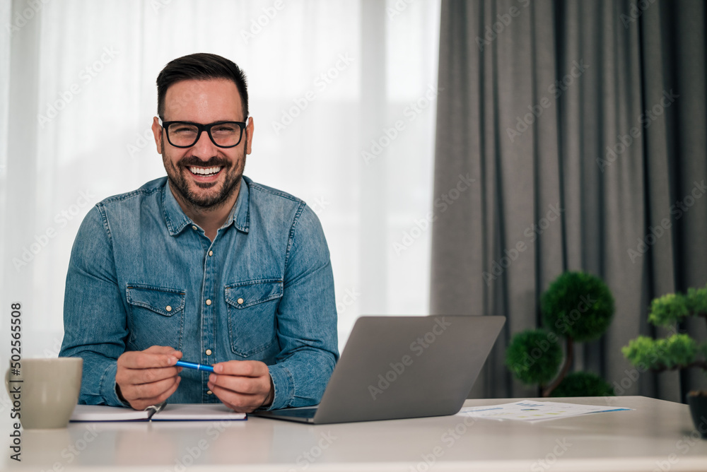 Portrait of successful happy entrepreneur using laptop at desk in office