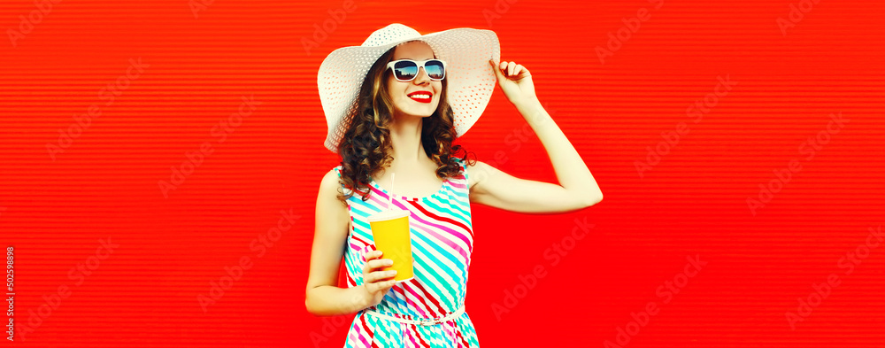 Portrait of happy smiling young woman with cup of juice looking away wearing summer hat on red background, blank copy space for advertising text