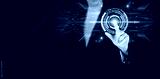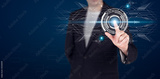 Businessman using fingerprints identification to access computer network, system data connection interface computer,