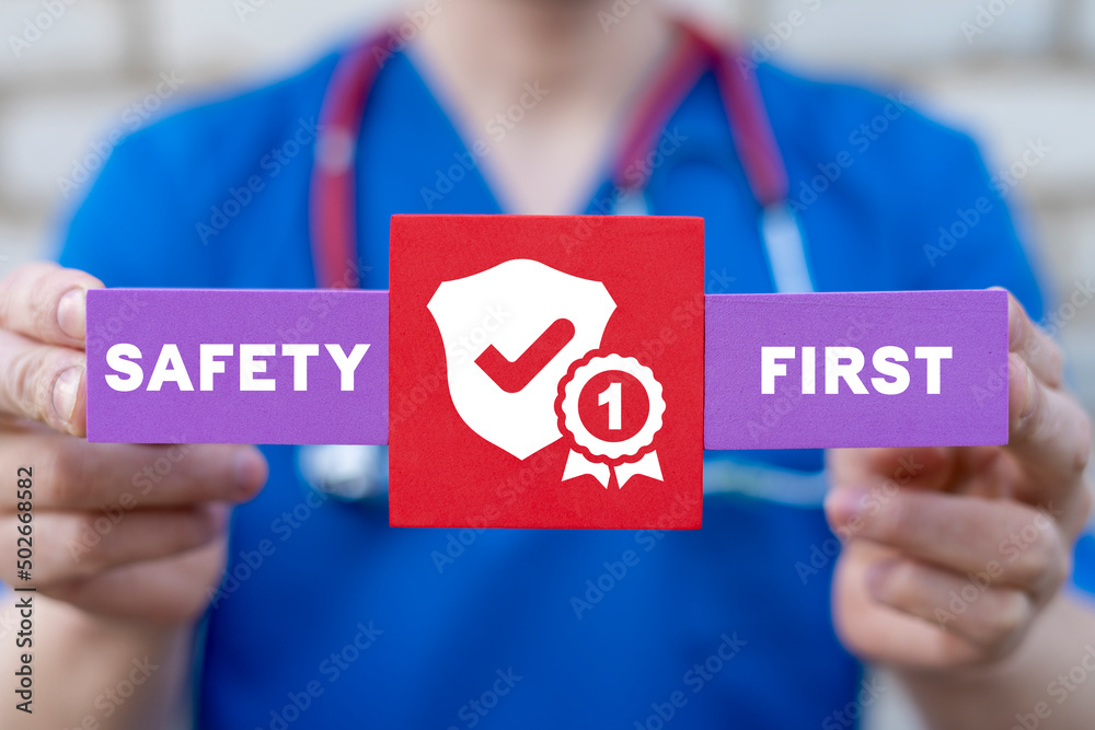 Safety First Medical Pharmaceutical Concept. Safety health regulations and standards in health care.