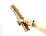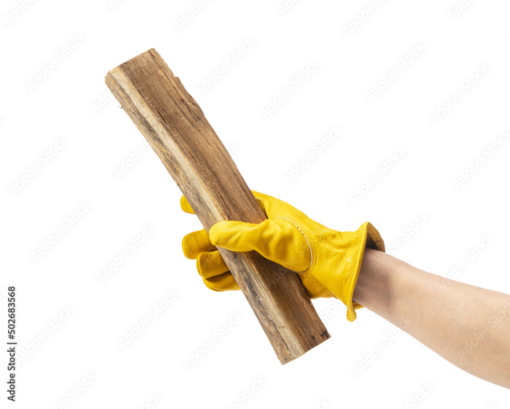 A male hand wearing yellow leather gloves holds firewood against a white background.