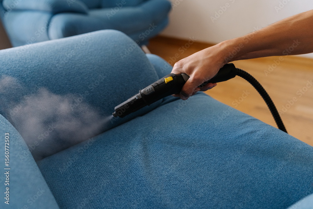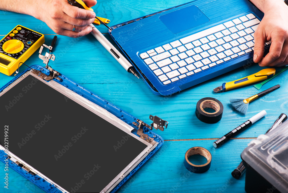 Wizard repairs laptop with tools and hands on the blue wooding table. top view