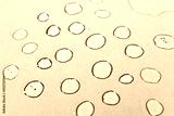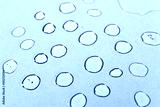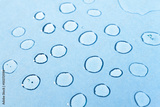 Drops of transparent liquid hyaluronic gel on a blue background top view. Bubble body care serum, skin treatment, moisturizing and maintaining elasticity with acid.